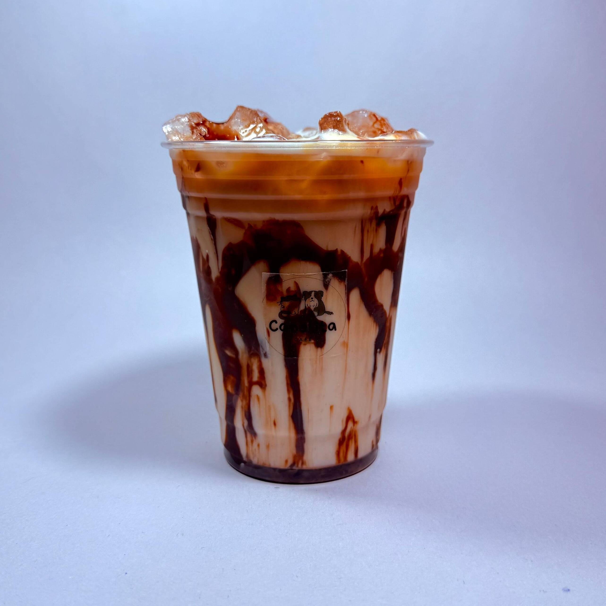 Bebida fría a base de leche espumada con shots de cafe y jarabe de chocolate🐾