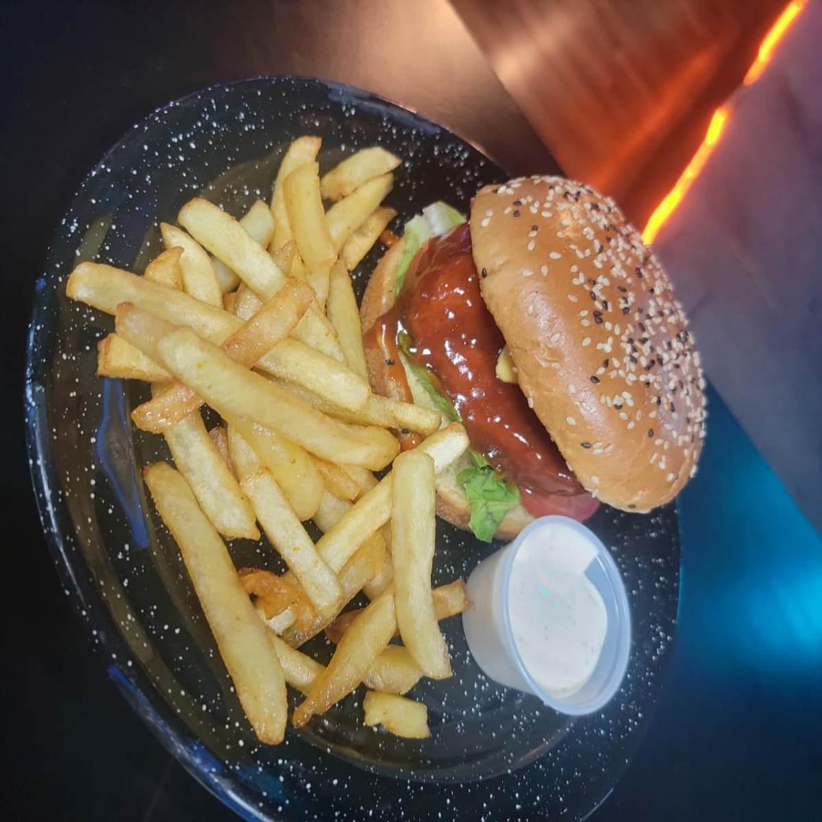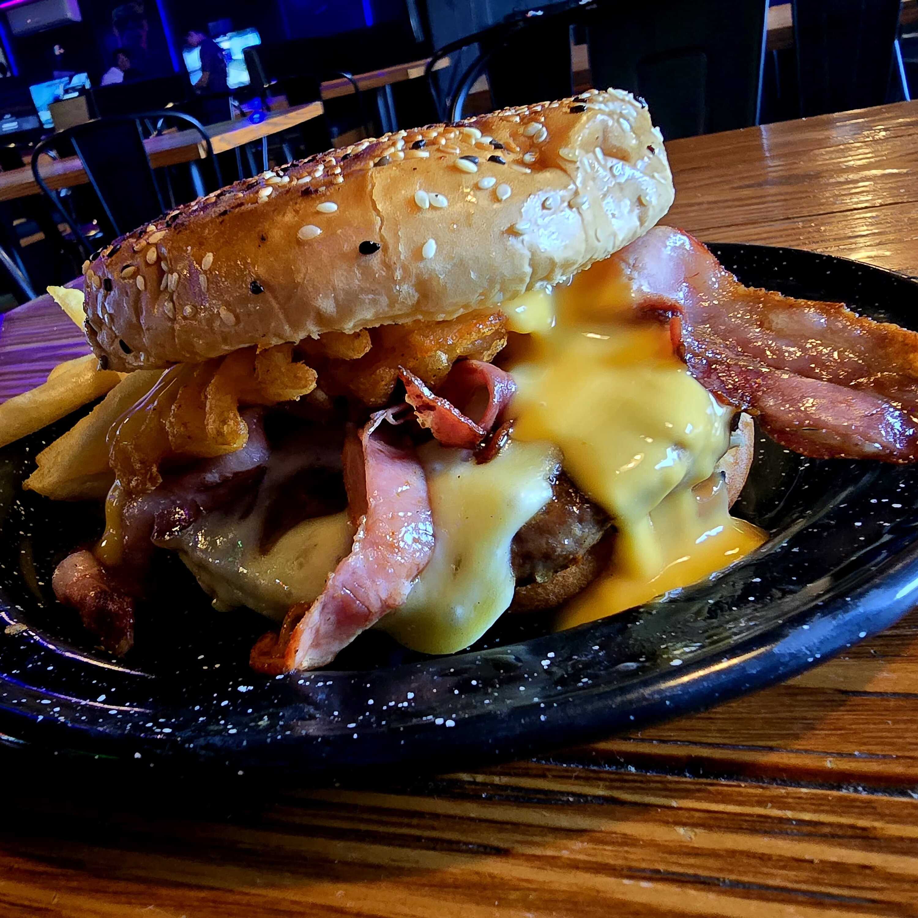 DELICIOSA CARNE DE RES BAÑADA EN SALSA BBQ AHUMADA , AROS DE CEBOLLA , QUESO MANCHEGO Y TOCINO CRUJIENTE + UNA PORCION DE PAPAS A LA FRANCESA