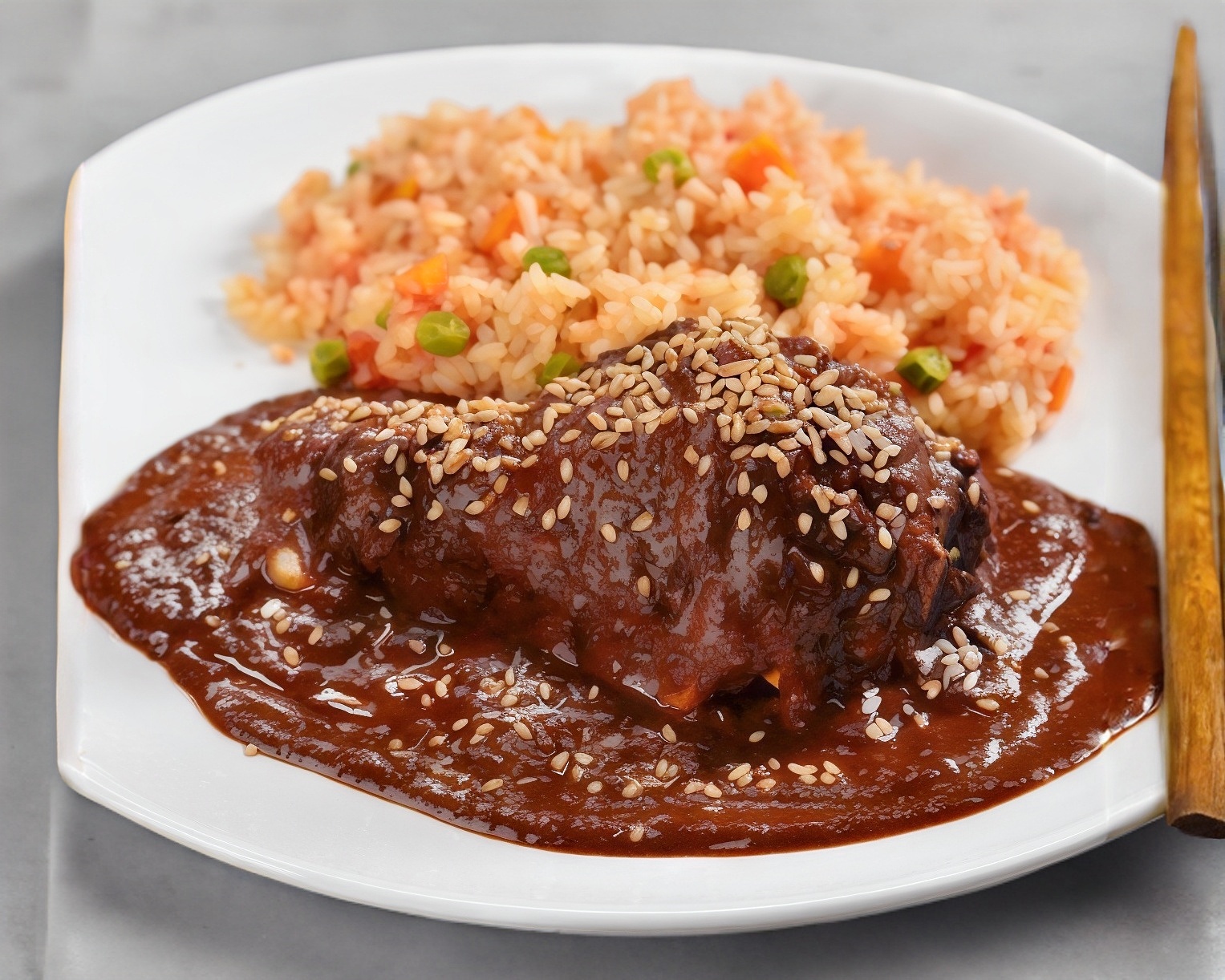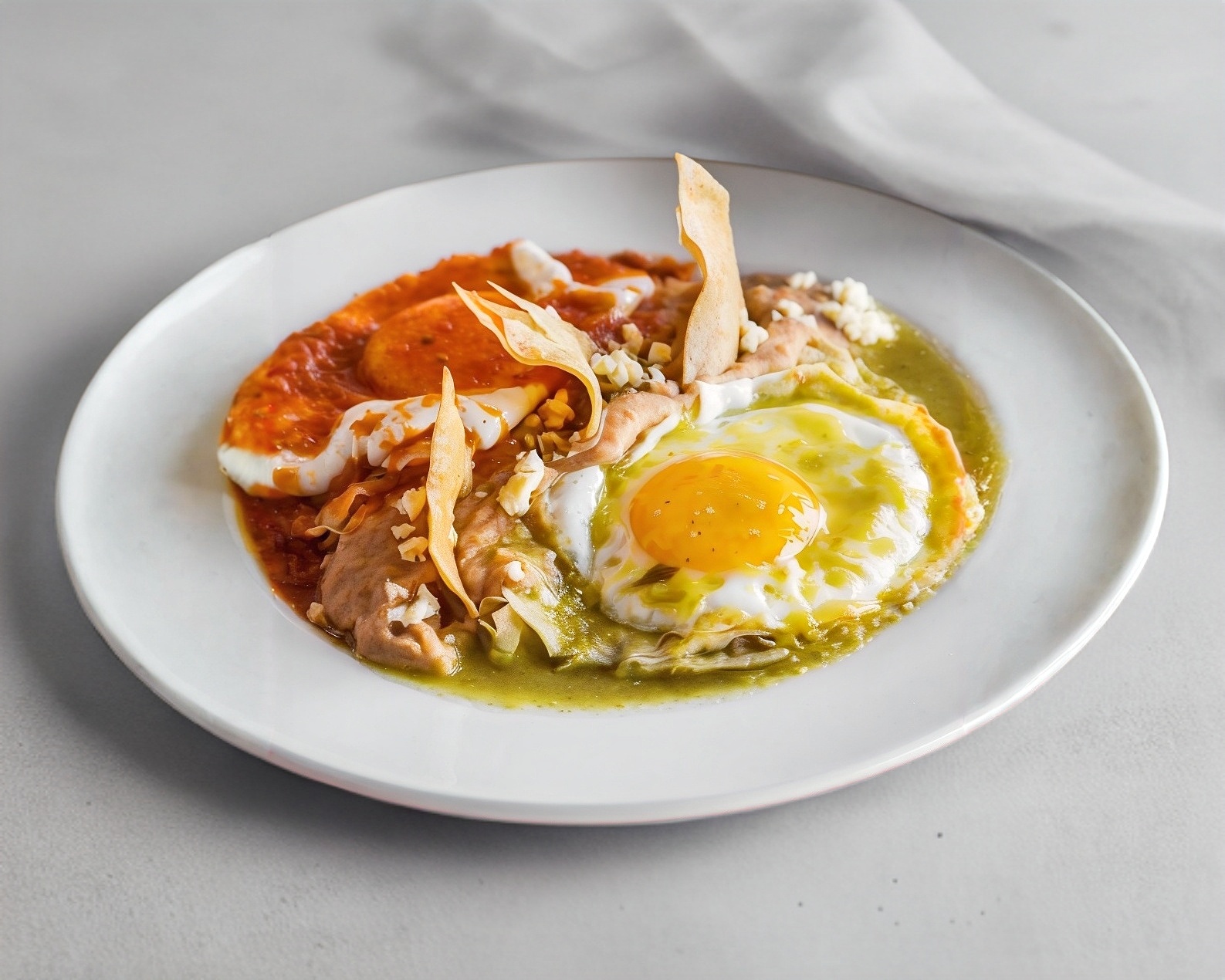 Totopos bañados con salsa verde. roja, ranchera, mole, tomate, chipotle, arroz y frijoles con un peso de 586 gramos. (para una persona)