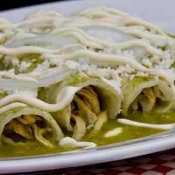 5 taquitos rellenos de pollo bañados en salsa verde con queso gratinado y crema, acompañado de frijoles refritos