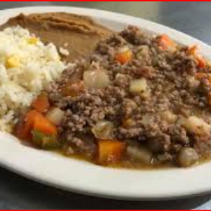 Rico picadillo casero acompañado de frijoles y arroz, tortillas y salsa