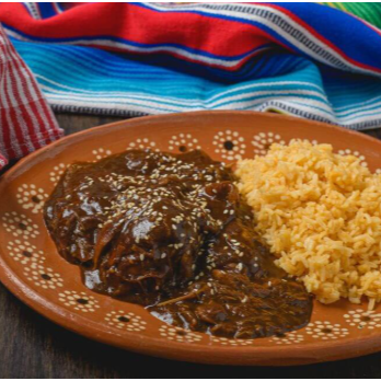 Mole poblano con pollo desmenuzado, arroz y tortillas