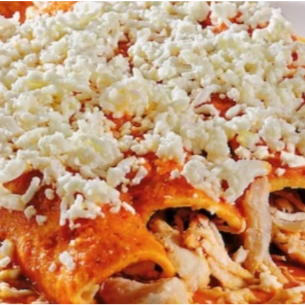 5 taquitos rellenos de pollo bañados en salsa de tomate con queso gratinado y crema, acompañado de frijoles refritos