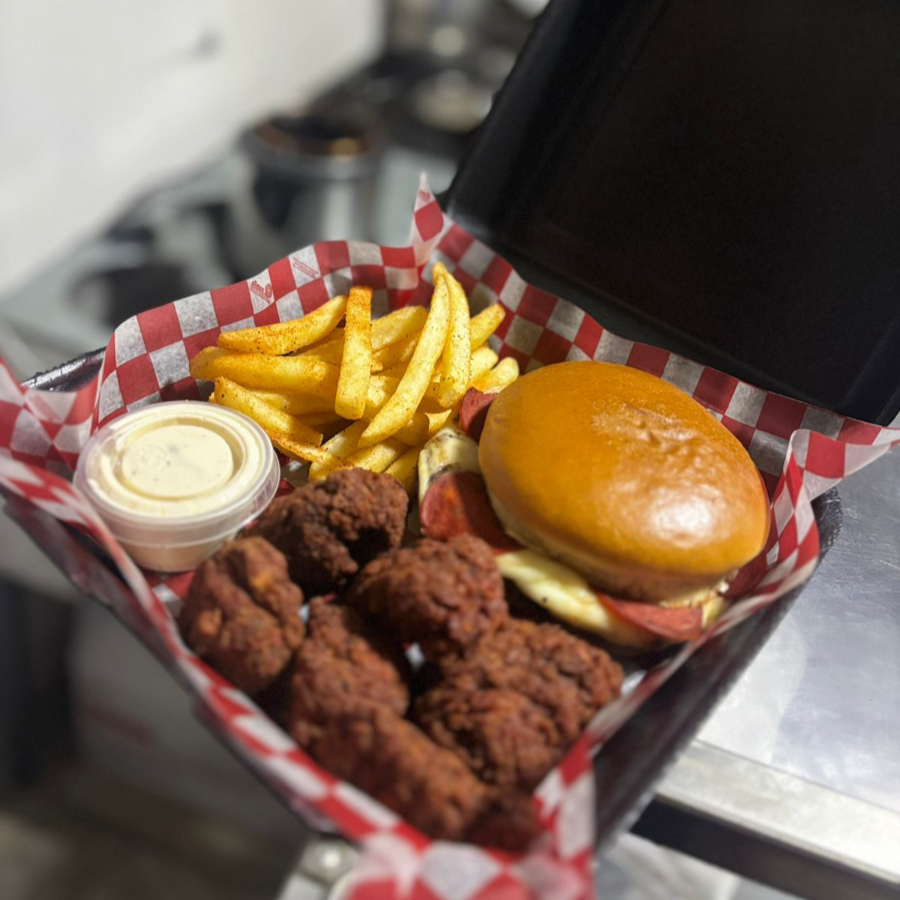Hamburguesa a elegir, orden de boneless bañados en salsa a elección, aderezo y orden de papas
