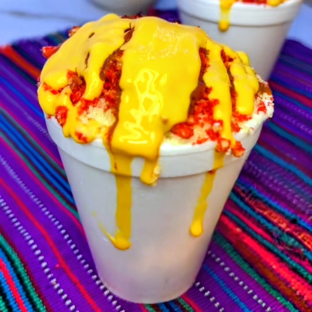 Vaso de 700ml chorreado de queso con elote, crema, 3 toppings y una bolsa de papas a elegir.