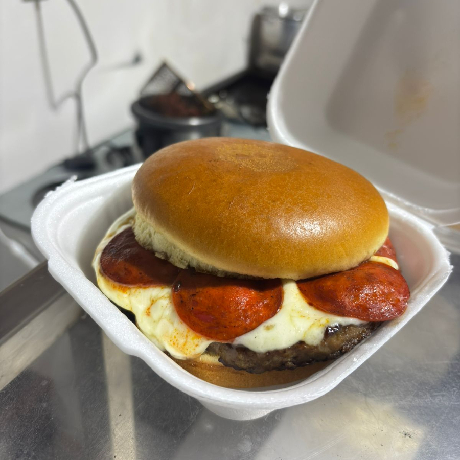 Hamburguesa de arrachera con queso mozzarella, pepperoni y salsa de tomate en pan brioche