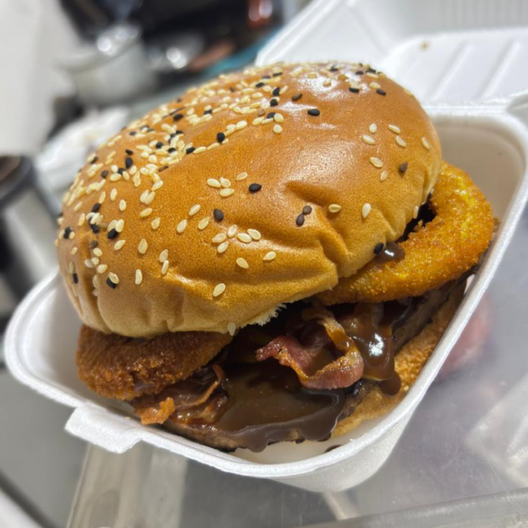 Hamburguesa de arrachera con queso americano, aros de cebolla, tocino, bbq y aderezo de la casa.