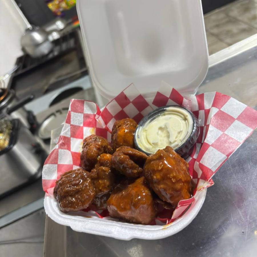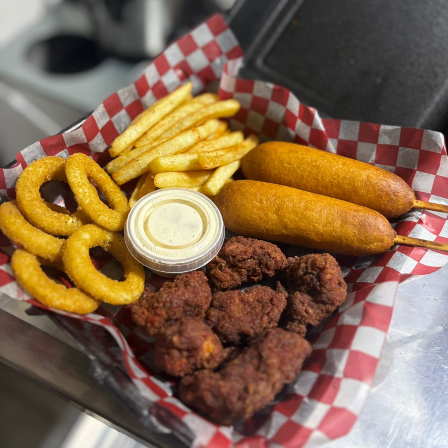 Orden de boneless bañados en salsa a elección, aderezo, orden de papas, aros de cebolla y dos banderillas americanas