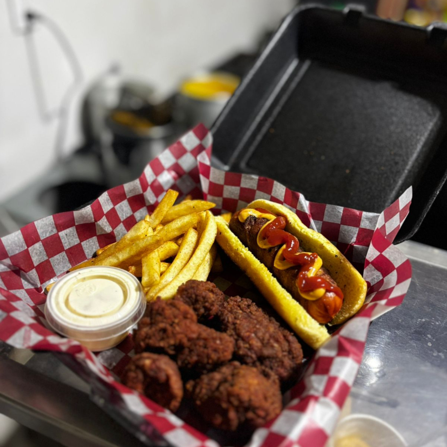 Hotdog a elegir, orden de boneless bañados en salsa a elección, aderezo y orden de papas