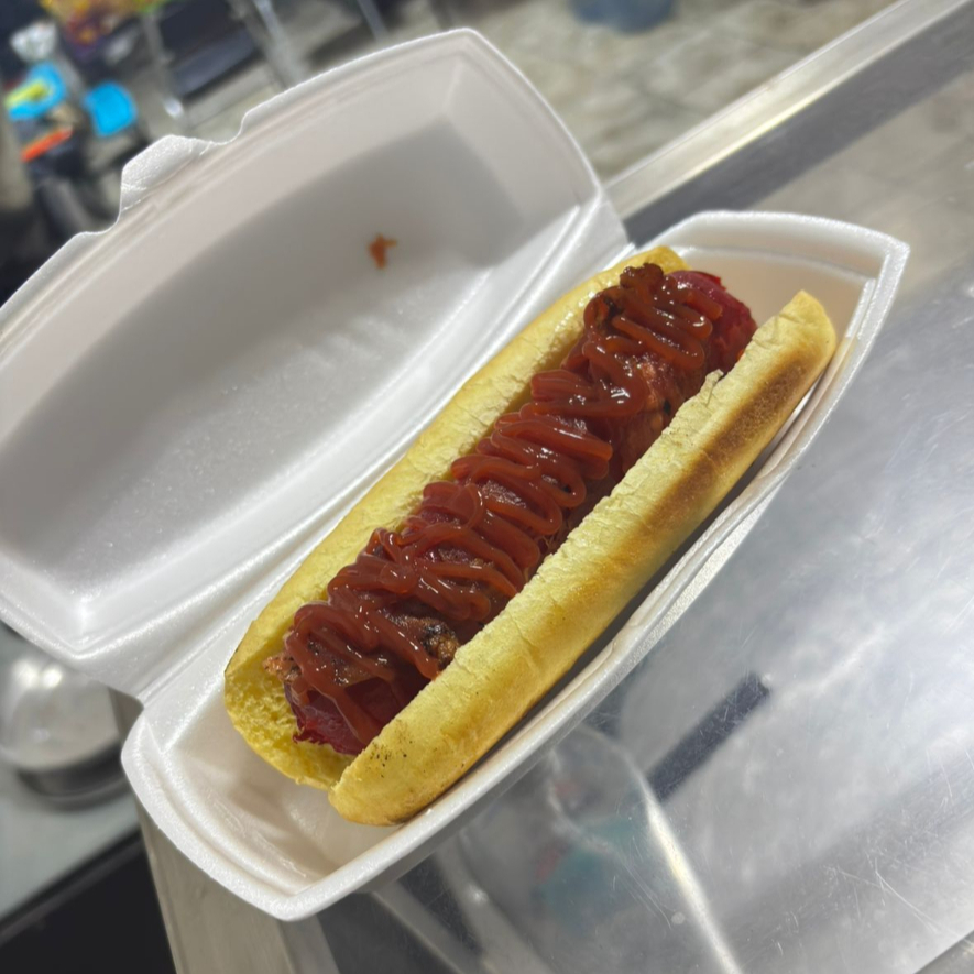Pan mediano, aderezo de la casa y salchicha de pavo envuelta en tocino. Acompañado de papas fritas y refresco