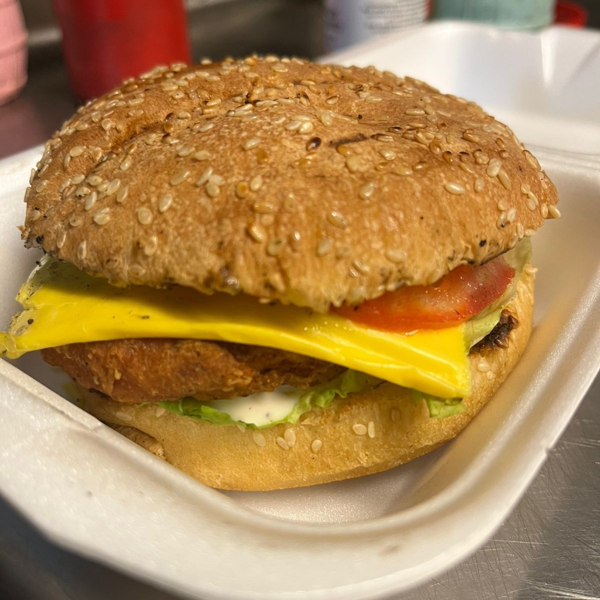 Pan, Carne de pollo empanizado Tempura, Queso Cheddar, Lechuga, Tomate, Aderezo ranch y aderezos