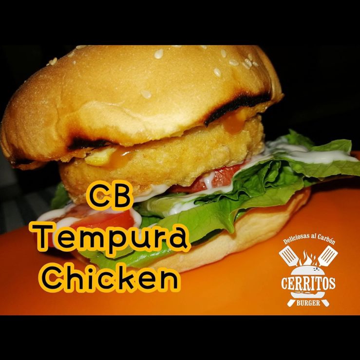 Pan, Doble carne de pollo empanizada Tempura, Queso Cheddar, Lechuga, Tomate, Aderezo Ranch y aderezos