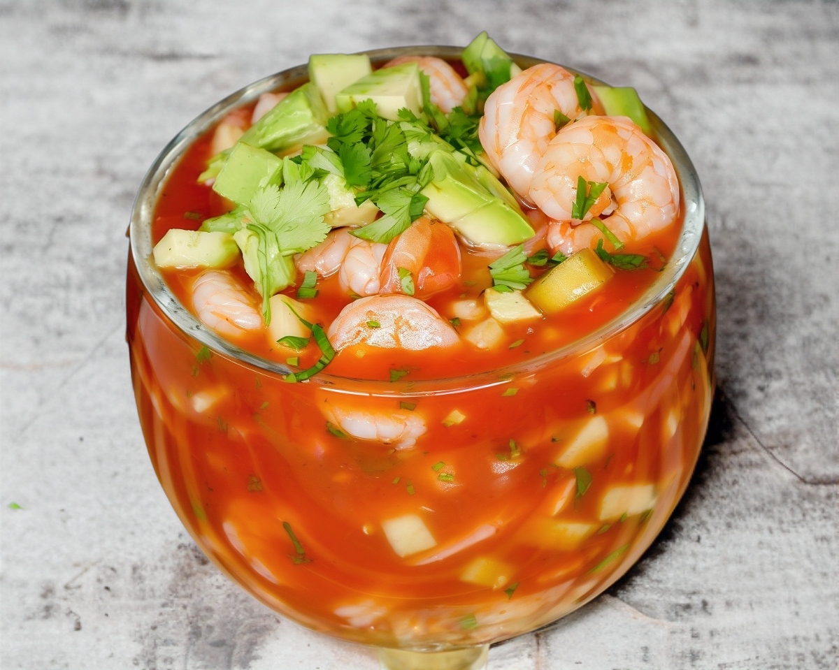 Coctel De camarón con cebolla morada, tomate, pepino, cilantro y aguacate