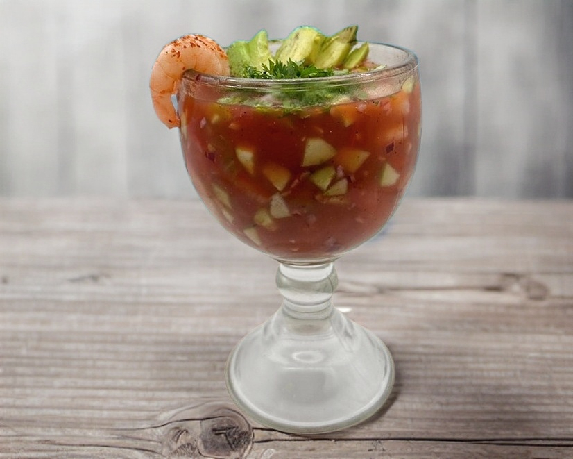 Camarón curtido en limón, con tomate , cebolla morada, pepino, cilantro y salsa de tomate.