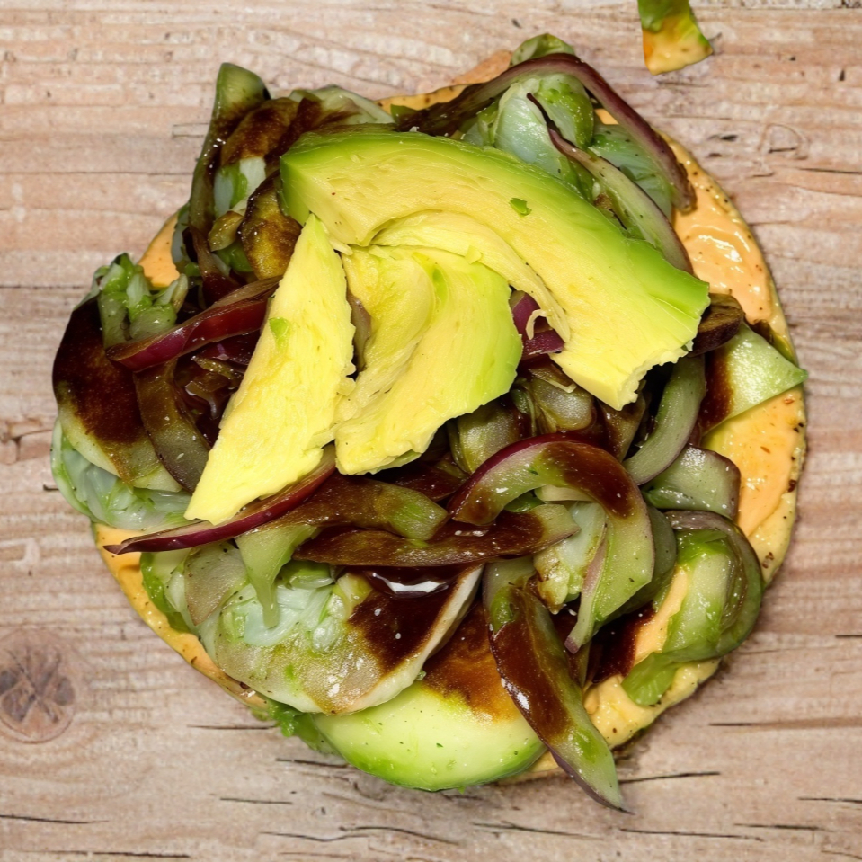 Tostada de maíz con camarón curtido, bañado en salsa negra de la casa, con cebolla morada y pepino.