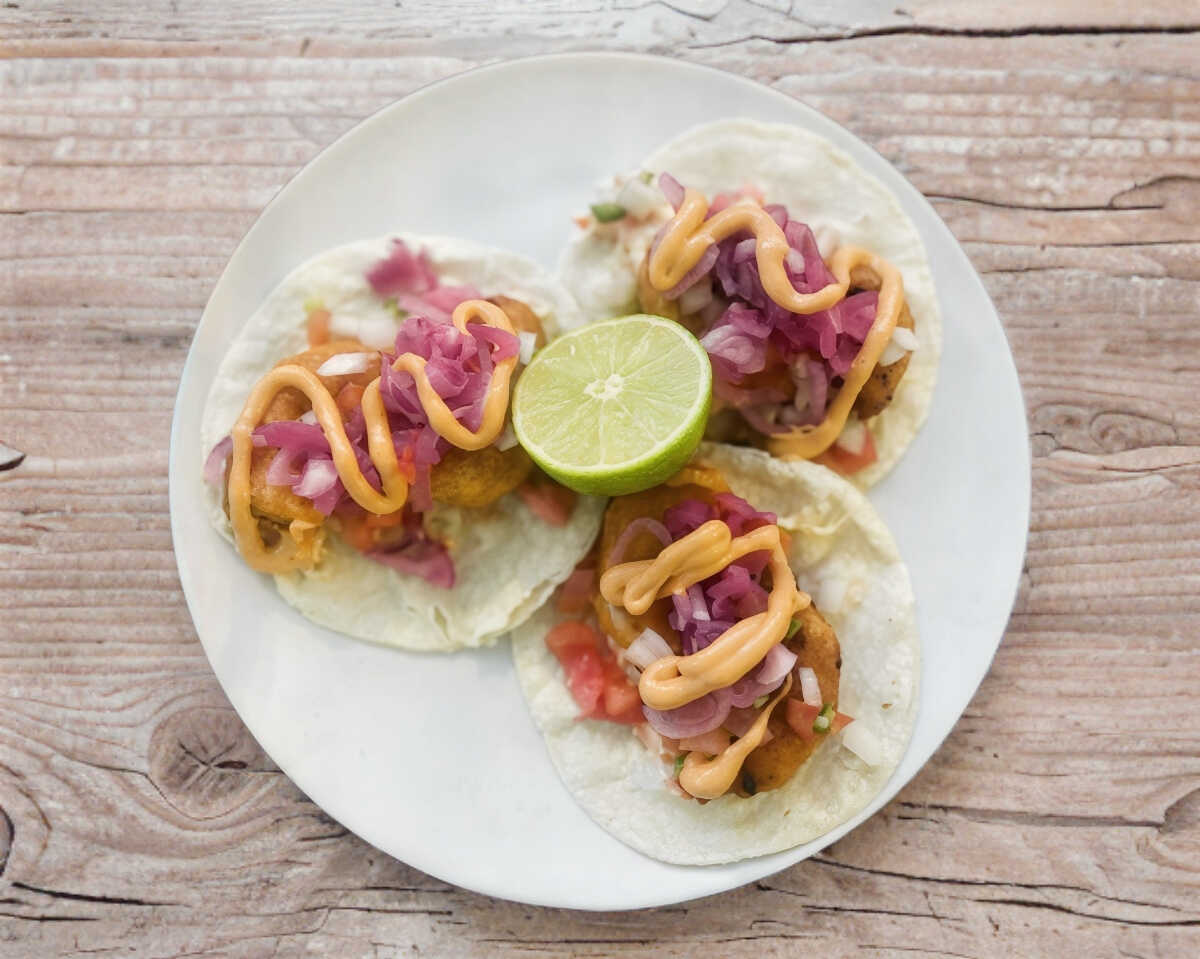 Tacos de camaron capeados, acompañado de aderezo de la casa, salsa bandera y cebolla morada con habanero
