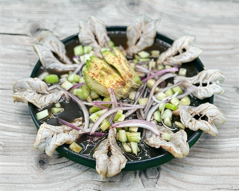 Camarón curtido en limón, cebolla morada, pepino y salsa negra de la casa.