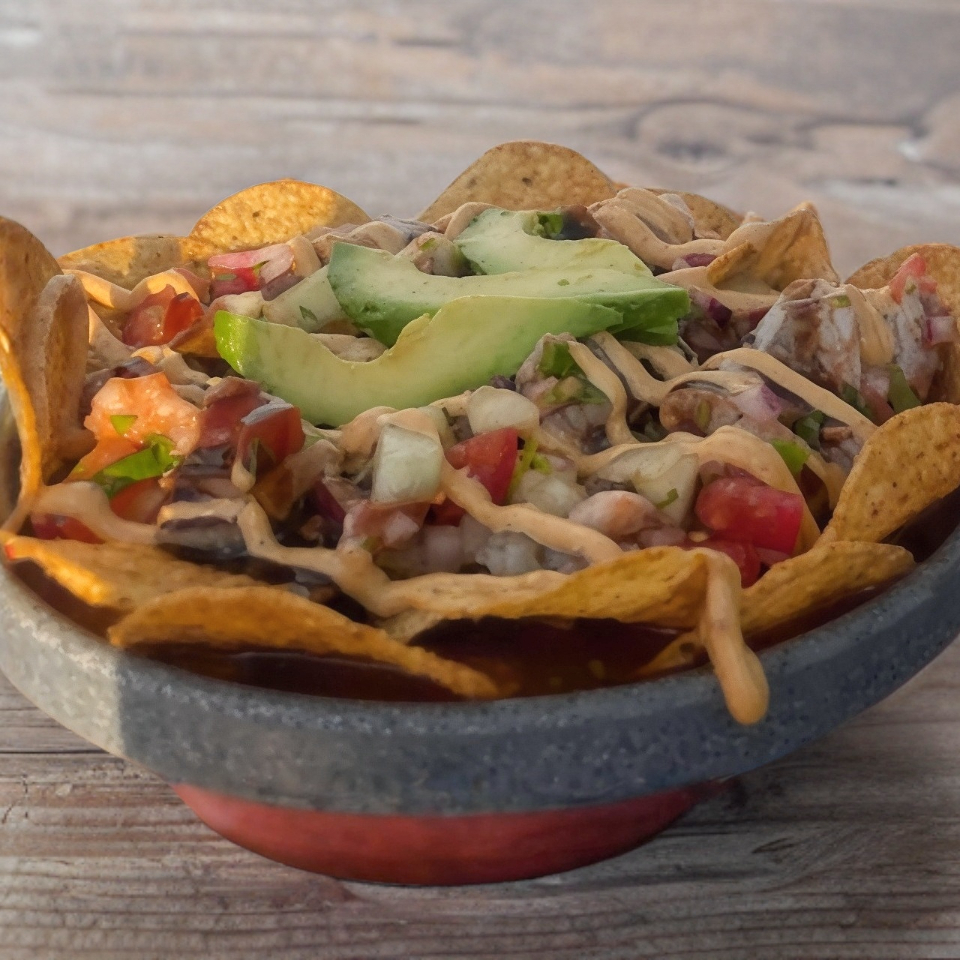Tostitos con ceviche de pescado, tomate, cebolla morada, pepino y cilantro. Incluye aderezo chipotle y salsa de la casa