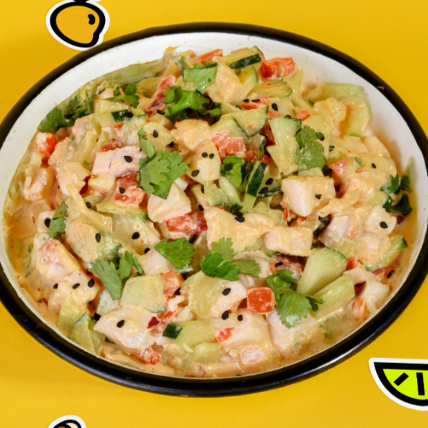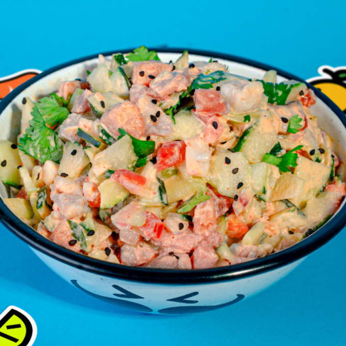 Ceviche de atún y pescado en una base cremosa sabor mayo-siracha. se acompaña con pepino, cebolla y tomate - porción personal para 3 tostadas (picante bajo).
