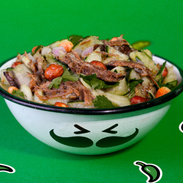 Ceviche de carne seca en una base de aguachile, se acompaña con pepino, cebolla, cilantro y cacahuate salado - porción personal para 3 tostadas (picante alto).