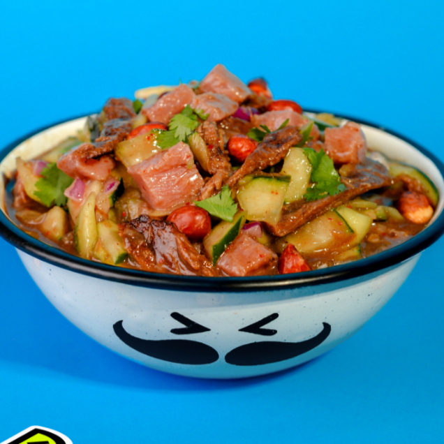 Ceviche de carne seca y atún en una base estilo oriental, con pepino, cebolla, cacahuate y cilantro - porción personal para 3 tostadas (picante alto).