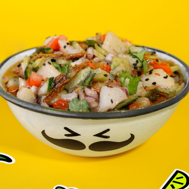 Ceviche de camarón en una base estilo oriental, con pepino, cebolla morada, cacahuate y cilantro - porción personal para 3 tostadas (picante alto).