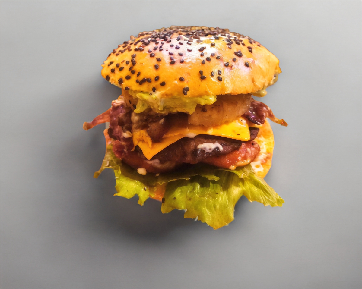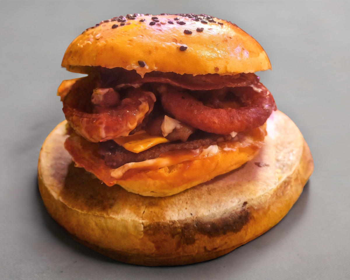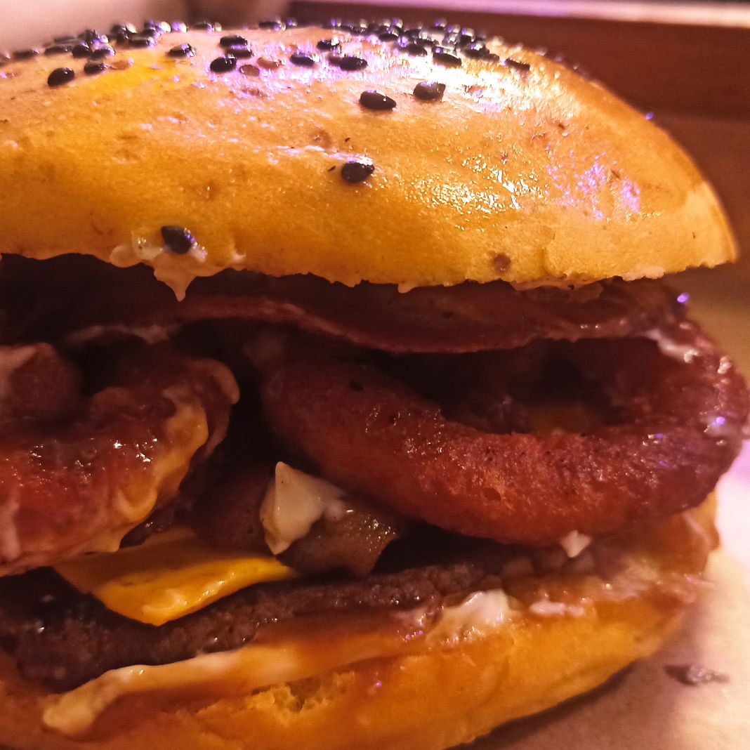 La reina de la casa: nuestra hamburguesa de carne de res, queso americano, tocino, aros de cebolla y salsa BBQ, en tamaño personal.