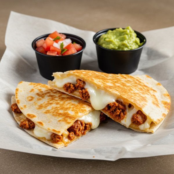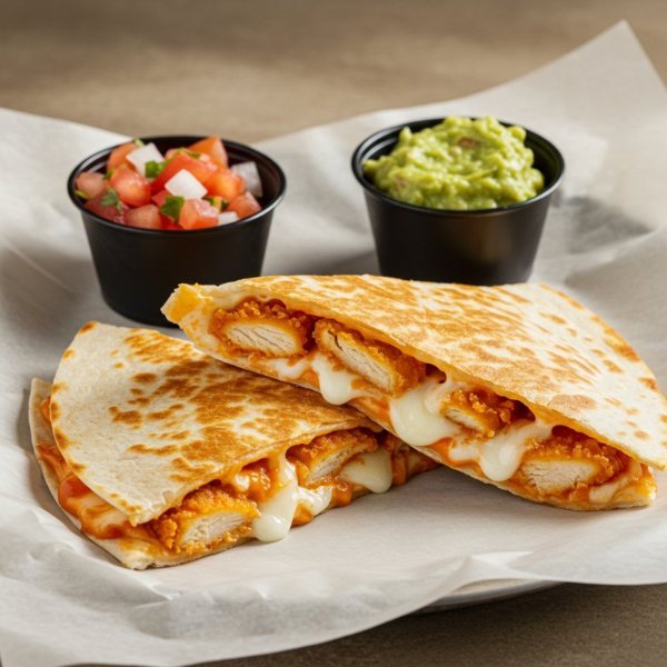 Sincronizada de tortilla de harina con milanesa de pollo, queso y salsa buffalo. Acompañada con pico de gallo y guacamole aparte.