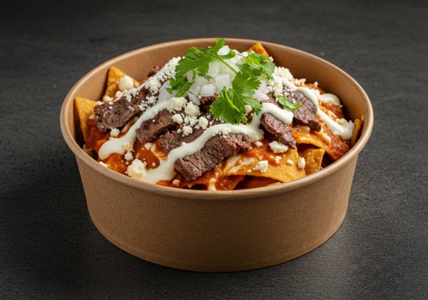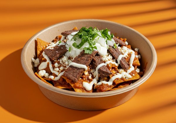 Chilaquiles con salsa roja, arrachera, queso, crema, cebolla y cilantro. *Salsa aparte para que decidas si los quieres suaves o crocantes.