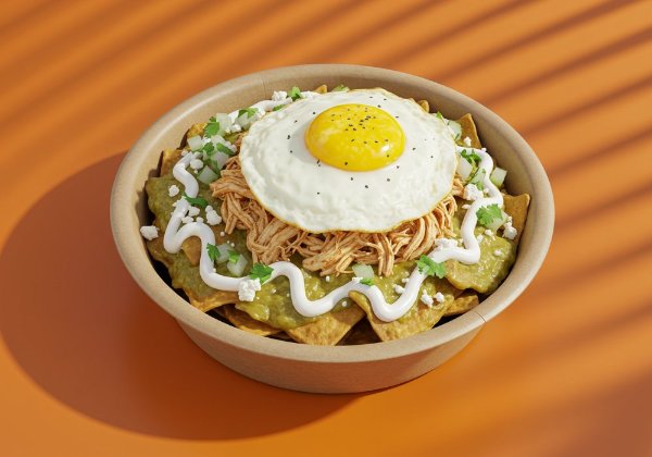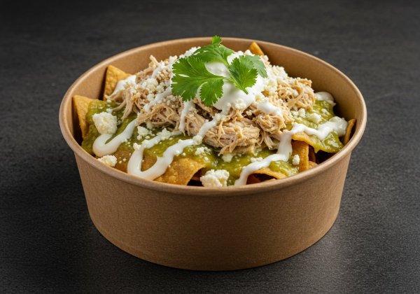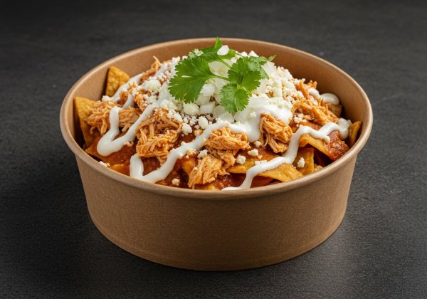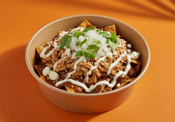 Chilaquiles con salsa del tradicional mole, pollo deshebrado, queso, crema, cebolla blanca, cilantro y ajonlí. *Salsa aparte para que decidas si los quieres suaves o crocantes.