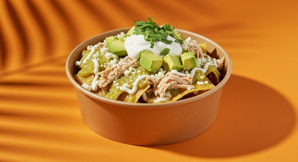 Chilaquiles con totopos horneados, pollo deshebrado, salsa verde, aguacate, queso, crema, cebolla y cilantro. *Salsa aparte para que decidas si los quieres suaves o crocantes.