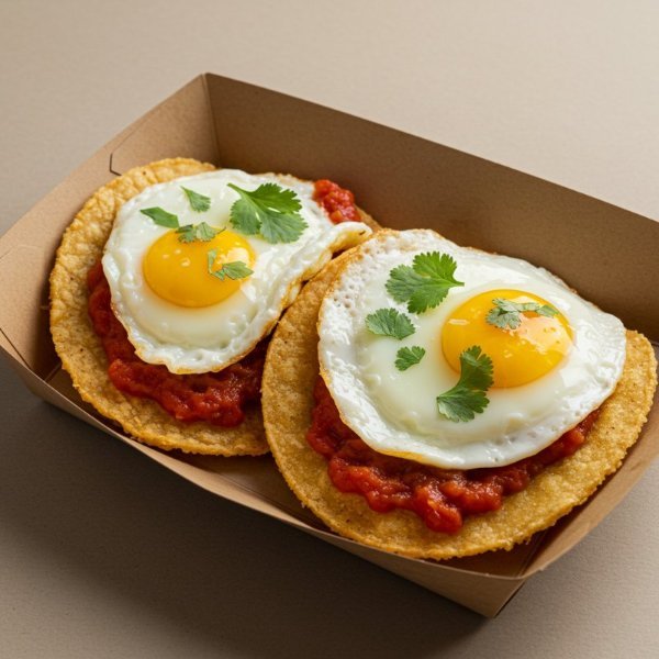 Dos huevos estrellados sobre tortillas fritas, bañados en salsa roja.