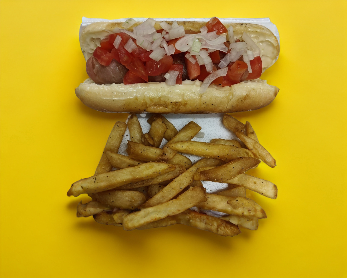 Hot-dog de salchicha de pavo envuelta en tocino, tomate y cebolla frescos, incluye porción de papas a la francesa sasonadas con pimienta-limón en polvo, cátsup, mostaza y jalapeños
