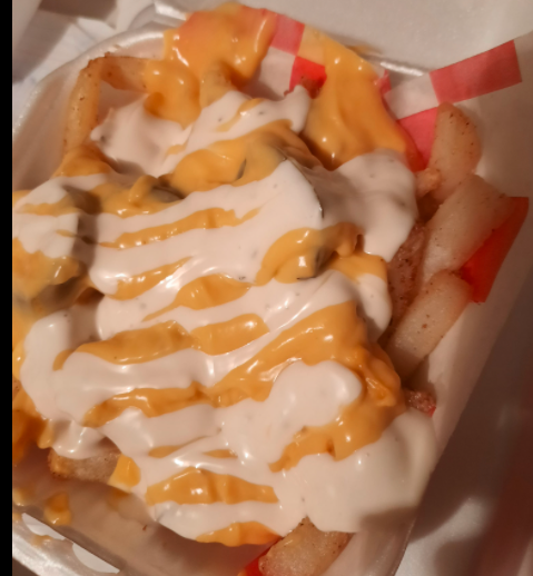 Orden de papas bañadas con queso cheddar c/s ranch.