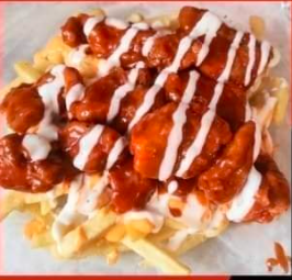 Base de papas a la francesa, con 6 boneless y bañados en salsa.