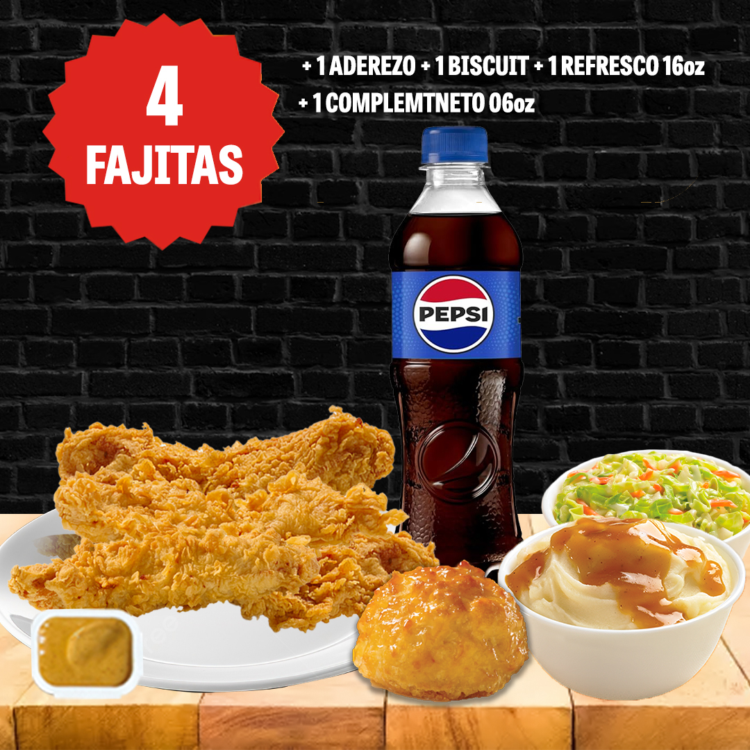 4 Fajitas de pollo + 1 complemento de 06oz a elegir + 1 refresco de 16oz + 1 biscuit + 1 aderezo a elegir
