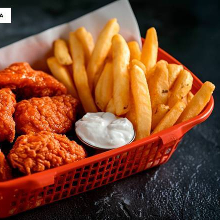 8 piezas de boneless bañadas en alguna salsa a su elección, acompañada de papas a la francesa y ranch