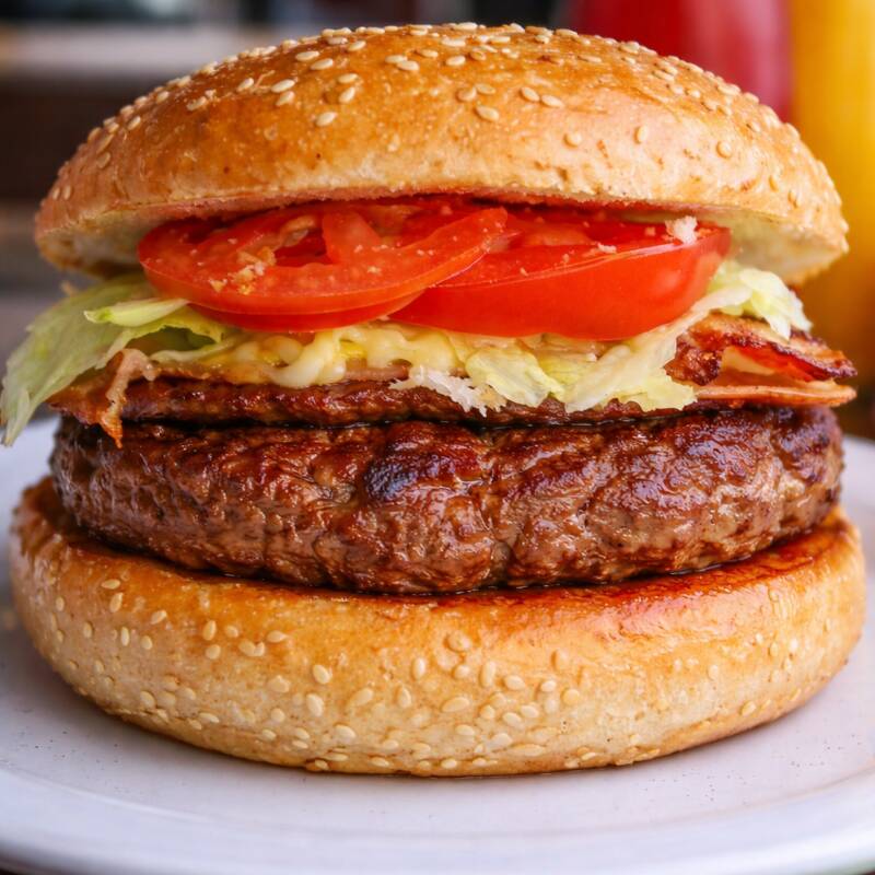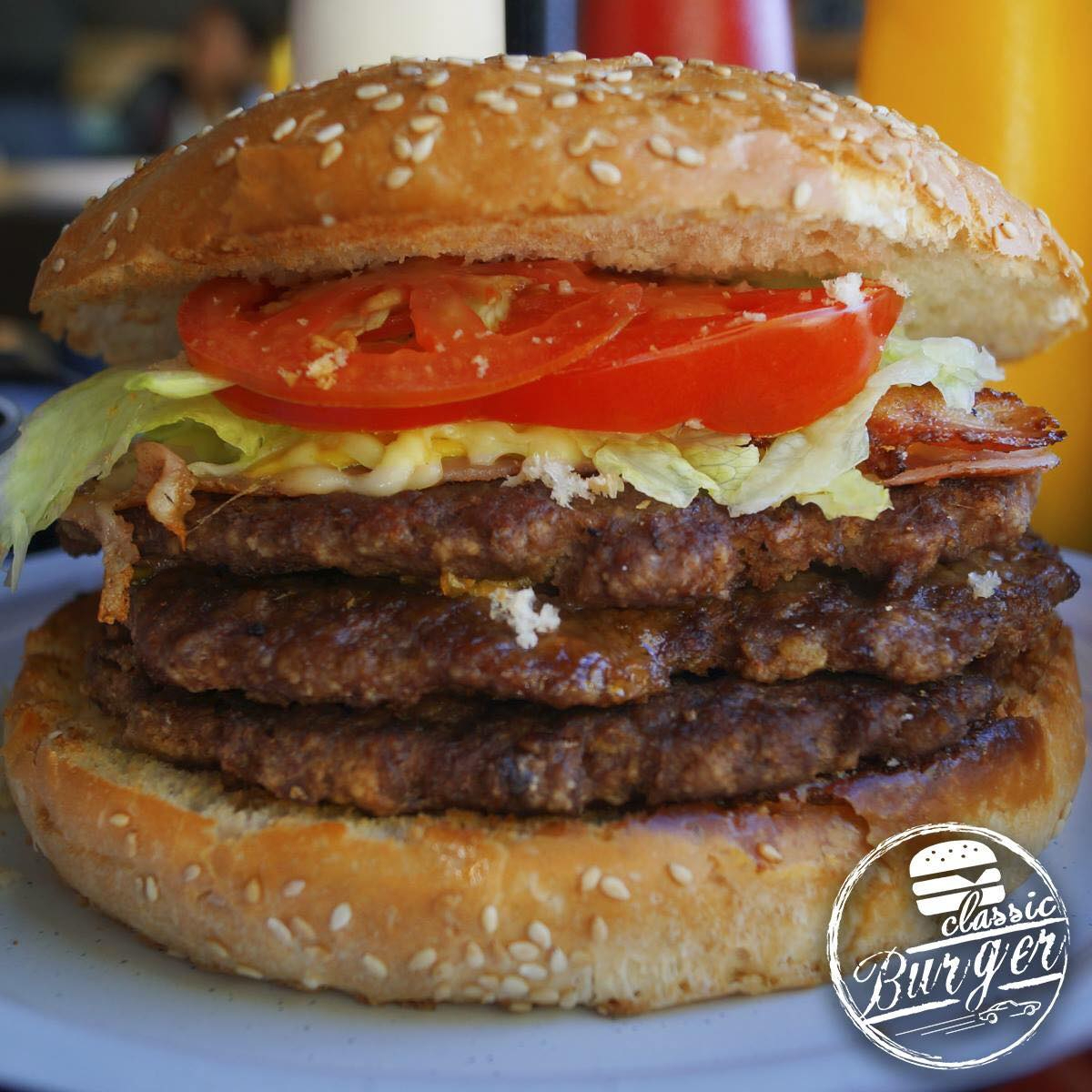 carne de res, jamon, tocino, queso americano, queso manchego y camaron