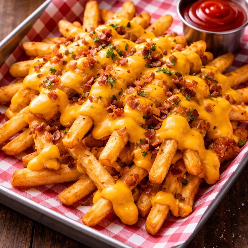 Papas con queso amarillo y en la parte superior mini boneless bañados en una salsa a su elección