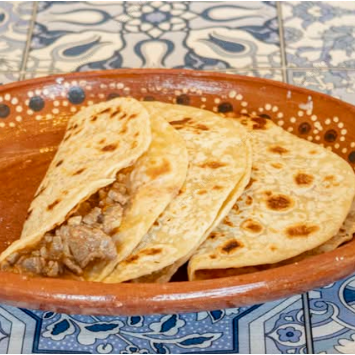 Deliciosos tacos de harina o maíz con una cama de frijoles y machacado.