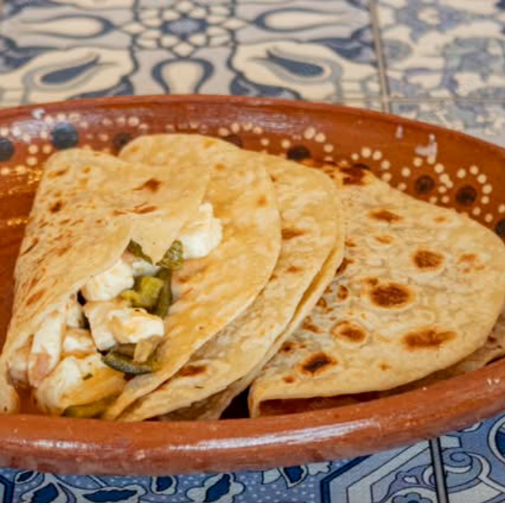 Taco en tortilla de harina o maíz relleno de queso con rajas.