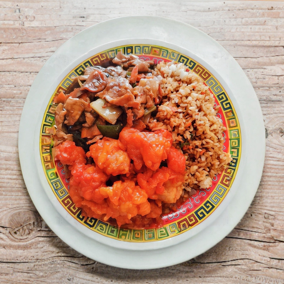 Pollo agridulce,brócoli con bistec/pollo,arroz mixto,coca 600ml.