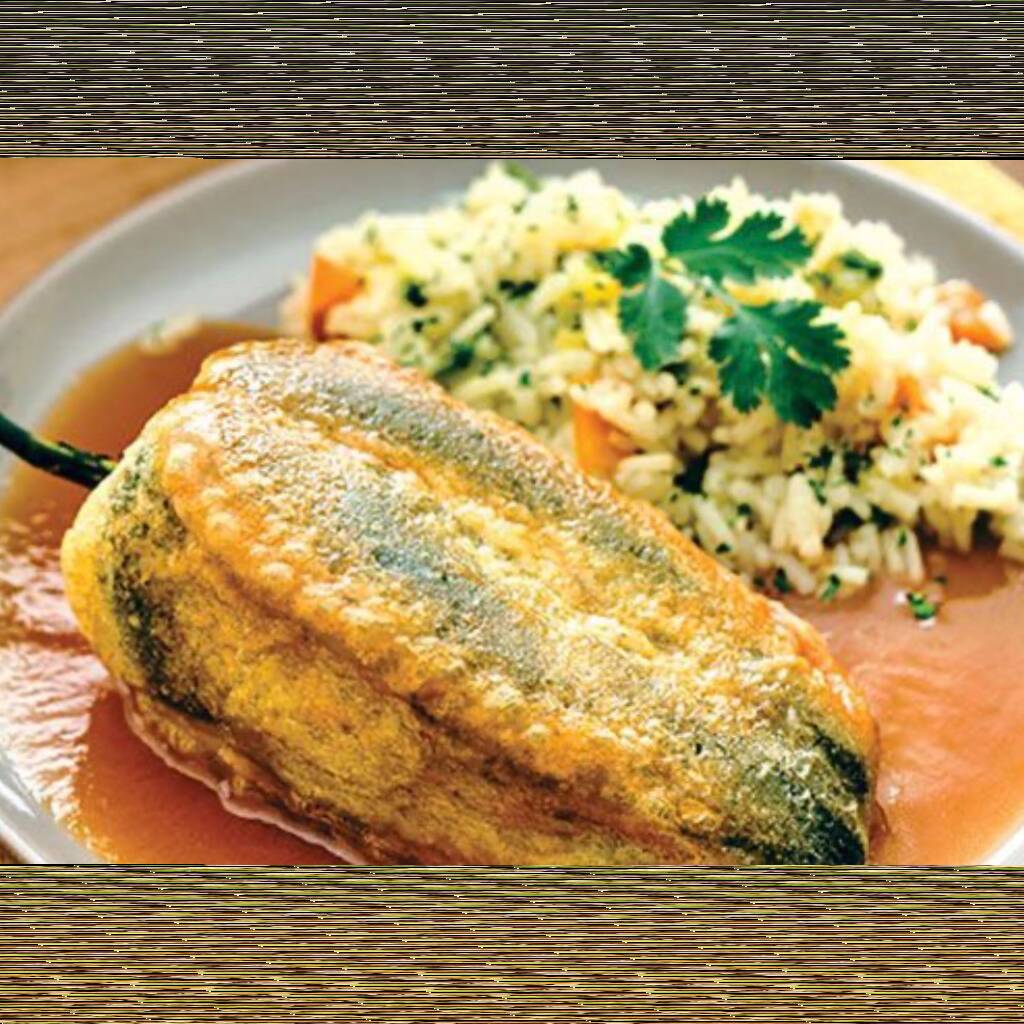 Chile relleno de picadillo incluye arroz y frijoles refritos