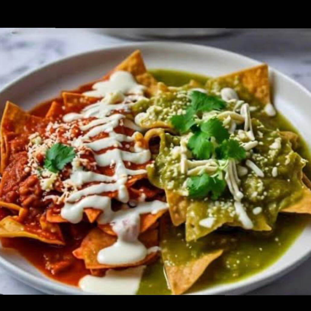 Chilaquiles mitad salsa roja y mitad verde acompañados de frijoles refritos 1 pieza de huevo y una porción de pollo