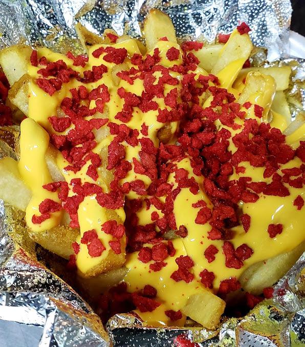 220 grms de papa a la francesa espolvoreadas con pimienta limón, queso cheddar y trocitos de tocino.