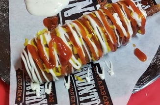 Salchicha empanizada con mayonesa, mostaza y cátsup.