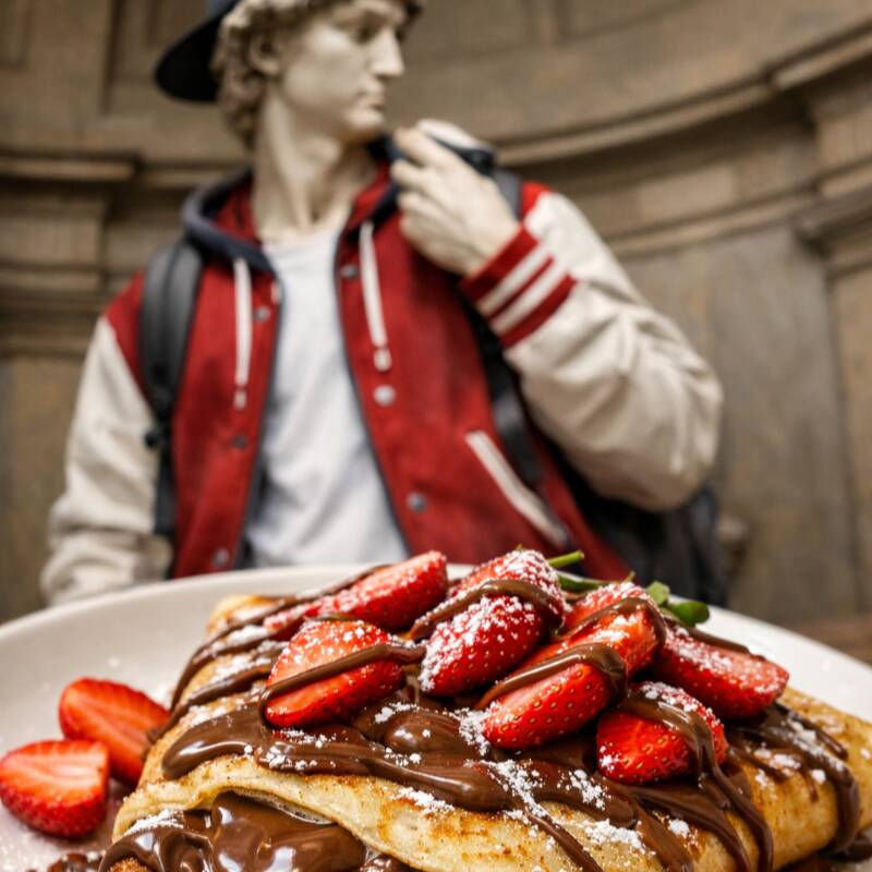 Deliciosa crepa hecha con una cremosa capa de nutella y fresas frescas en cada bocado suave y calientita