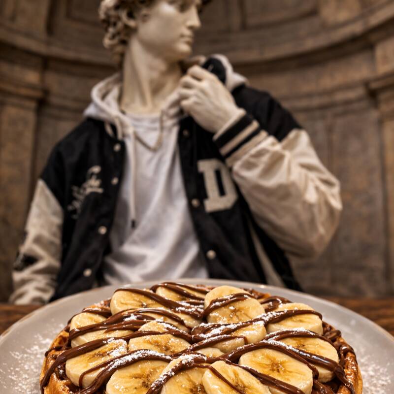 Crujiente waffle con una capa de nutella y rodajas de platano