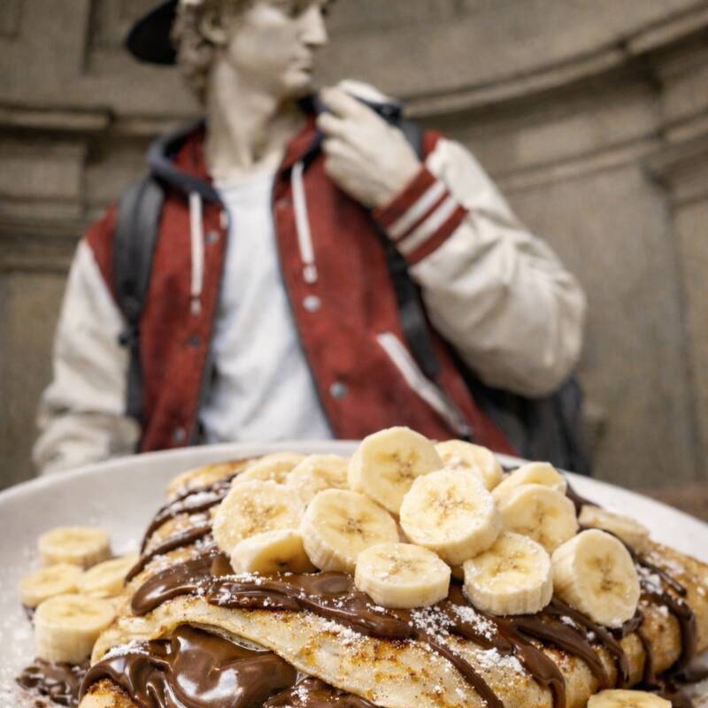 Deliciosa crepa con base de nutella con rodajas de platano fresco una combinacion perfecta entre lo dulce y la suavidad del platano