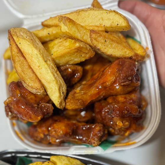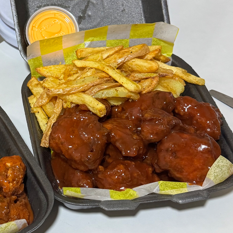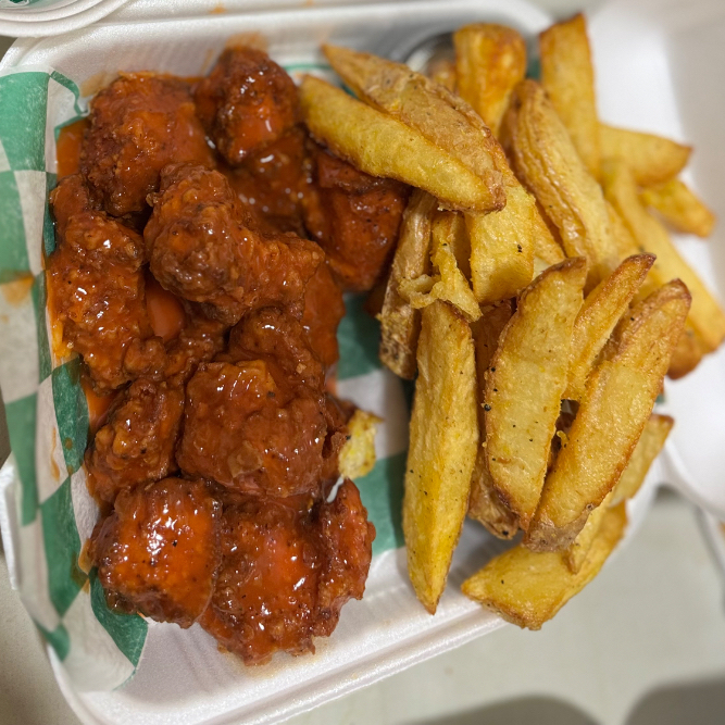 6 pz de boneless en la salsa a elegir, acompañados de papas a la francesa caseras y aderezo ranch